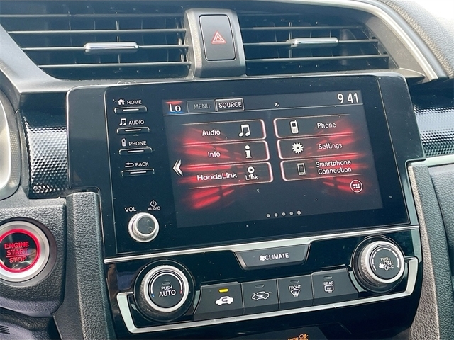 Black w/Fabric Seating Surfaces, 4-Wheel Disc Brakes, 8 Speakers, ABS brakes, Adaptive Cruise Control: Adaptive Cruise Control (ACC) with Low-Speed Follow, Air Conditioning, Alloy wheels, AM/FM radio, Apple CarPlay/Android Auto, Auto High-beam Headlights, Automatic temperature control, Brake assist, Bumpers: body-color, Cloth Seat Trim, Delay-off headlights, Driver door bin, Driver vanity mirror, Dual front impact airbags, Dual front side impact airbags, Electronic Stability Control, Emergency communication system: HondaLink, Exterior Parking Camera Rear, Forward collision: Collision Mitigation Braking System (CMBS) + FCW mitigation, Four wheel independent suspension, Front anti-roll bar, Front Bucket Seats, Front Center Armrest, Front fog lights, Front reading lights, Fully automatic headlights, Illuminated entry, Lane departure: Lane Keeping Assist System (LKAS) active, Leather Shift Knob, Low tire pressure warning, Occupant sensing airbag, Outside temperature display, Overhead airbag, Panic alarm, Passenger door bin, Passenger vanity mirror, Power door mirrors, Power steering, Power windows, Radio data system, Radio: 180-Watt AM/FM Audio System, Rear anti-roll bar, Rear window defroster, Remote keyless entry, Security system, Speed control, Speed-sensing steering, Split folding rear seat, Spoiler, Steering wheel mounted audio controls, Tachometer, Telescoping steering wheel, Tilt steering wheel, Traction control, Trip computer, Wheels: 18`` Alloy w/Gloss Black Inserts, Black w/Fabric Seating Surfaces.